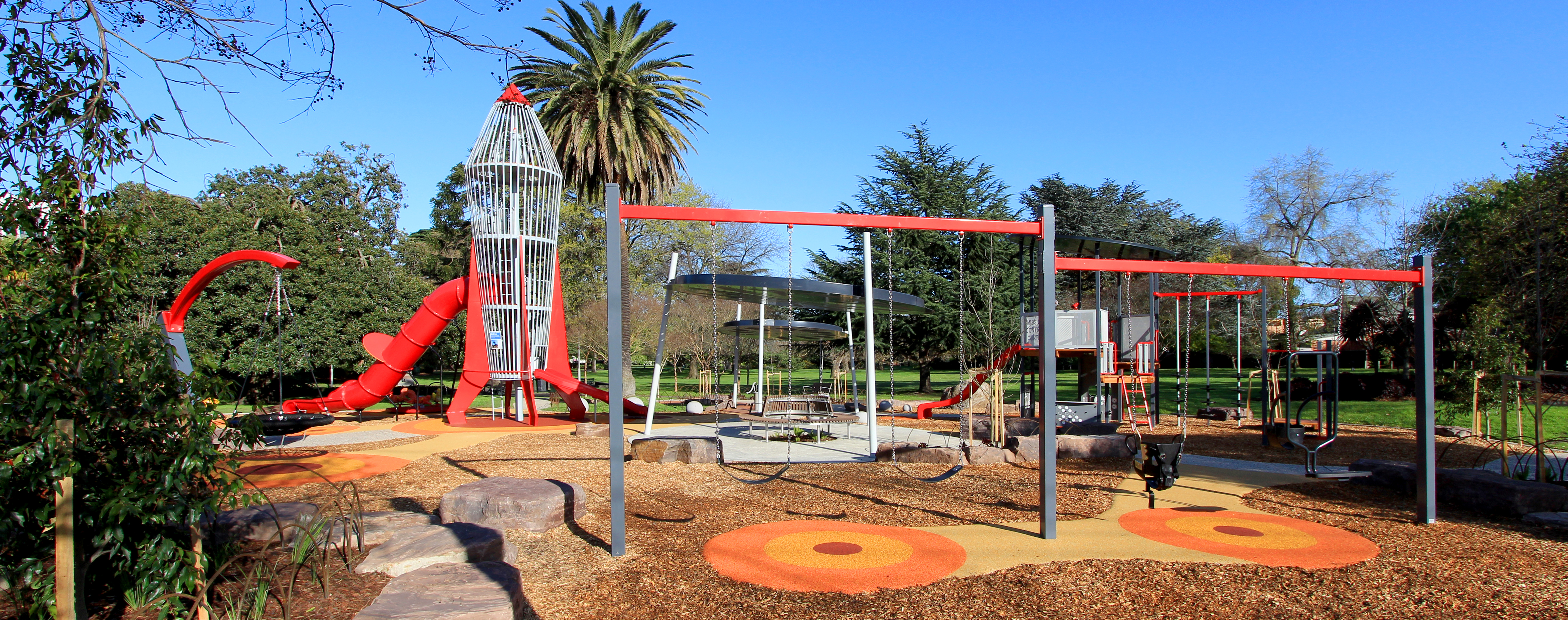 "This playground uses natural materials cleverly mixed with the more constructed forms of playground equipment. The overall appearance is one of a clearing in a bush setting offering natural stimulation that is hard to find in other playgrounds.