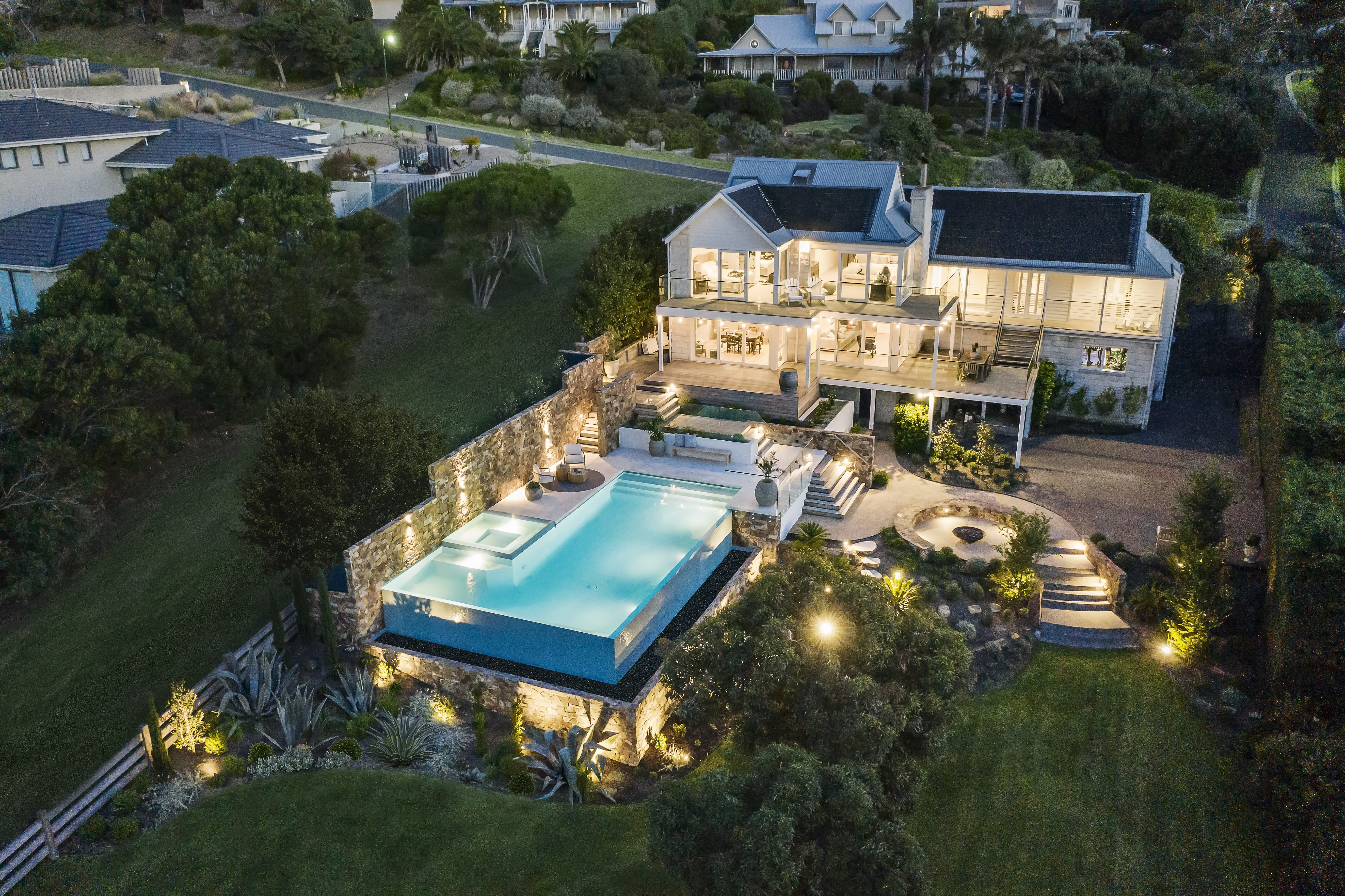 Consideration of the borrowed landscape is reflected in the mixed planting selection creating a relaxed style which complements the architecture of the home and the client’s lifestyle. Offering an inviting environment to sit and admire the surrounding views, the plant choices add form, texture and colour contrast to the various entertaining and play zones."
