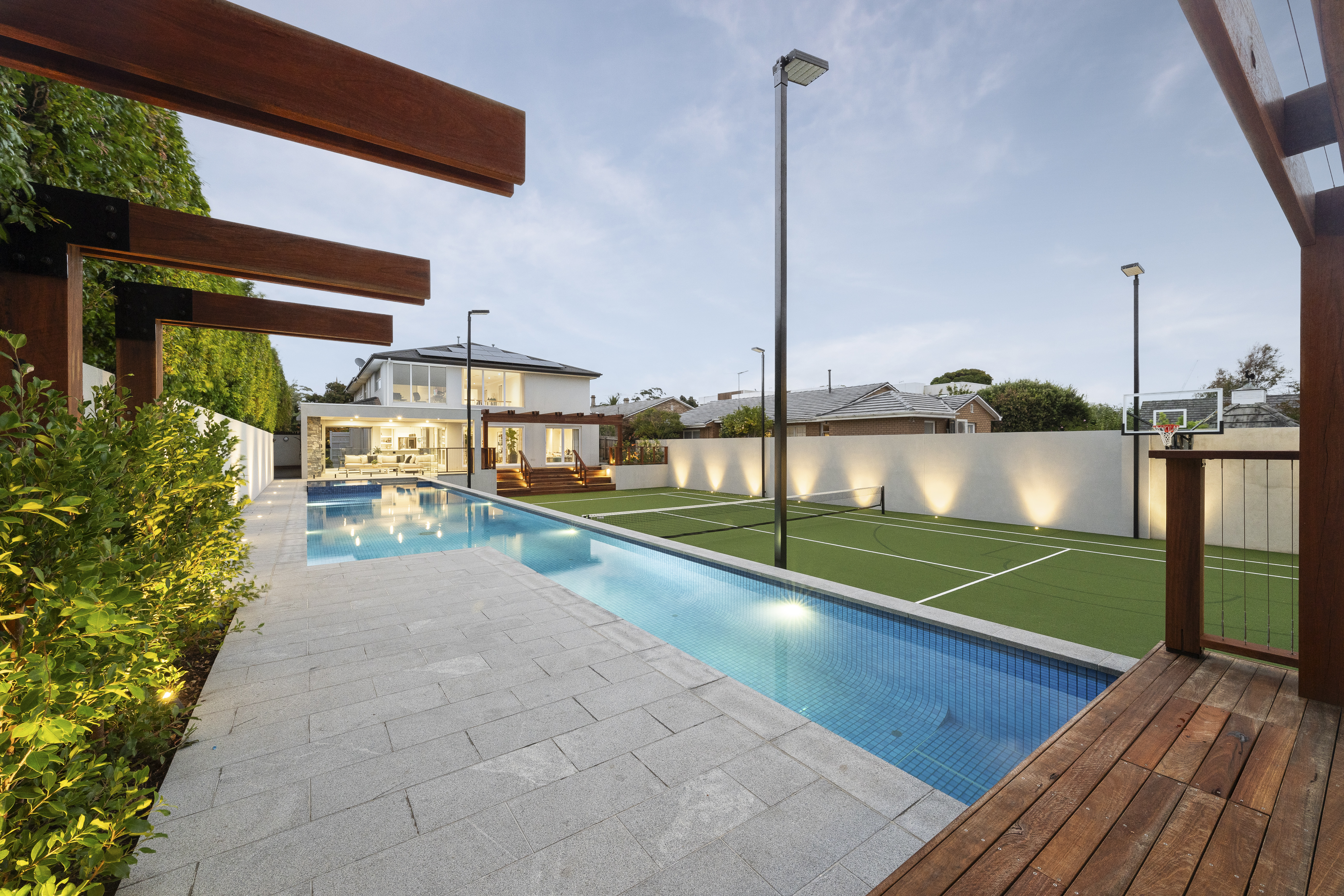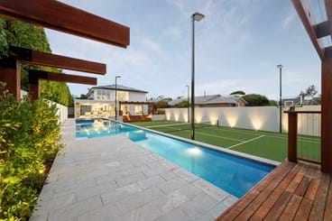 An impressive 20-by-9-metre pool features a built-in spa, bold striped tile design, a beach area, water features, and fibre optic lighting for a complete resort feel.