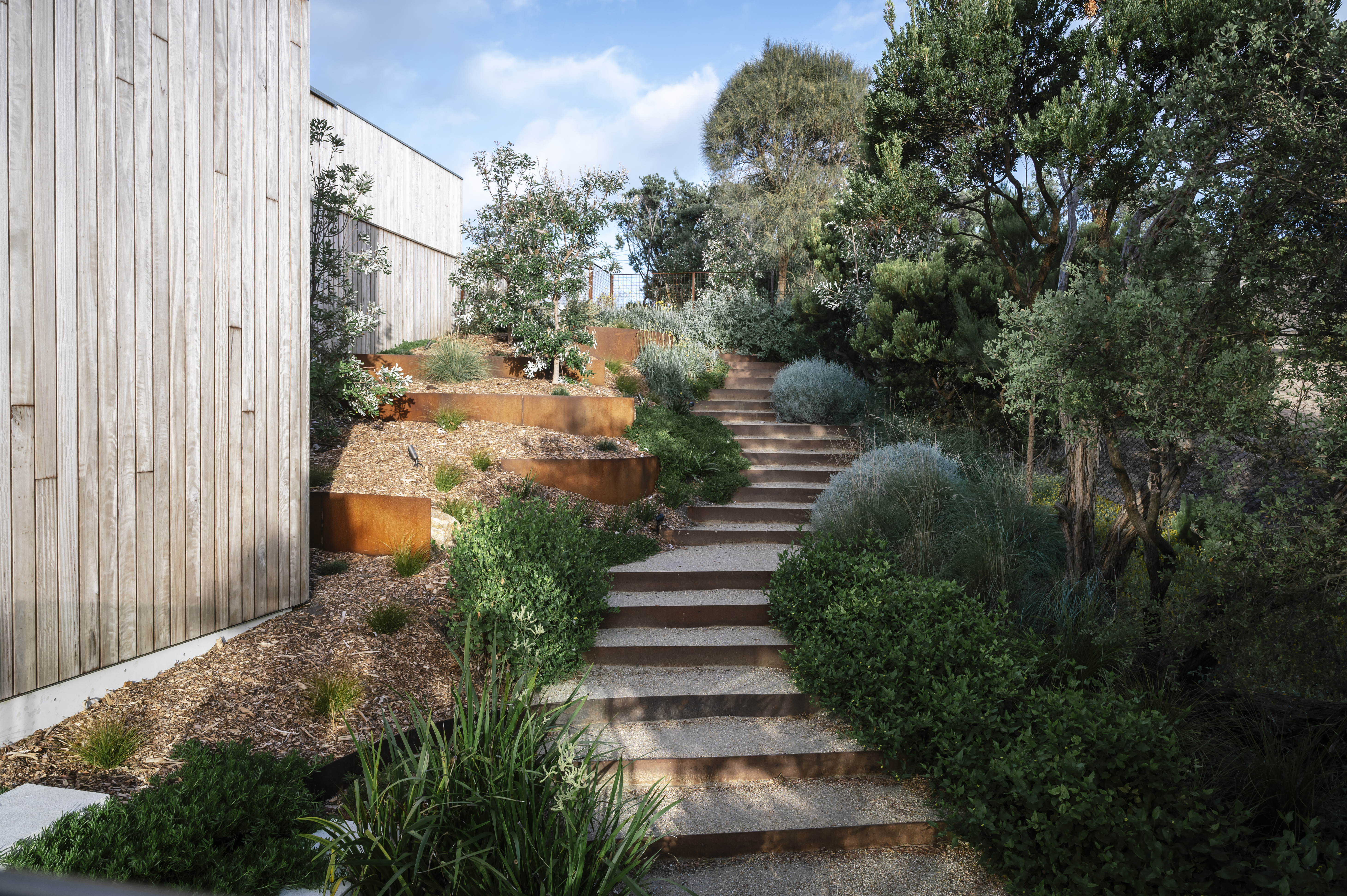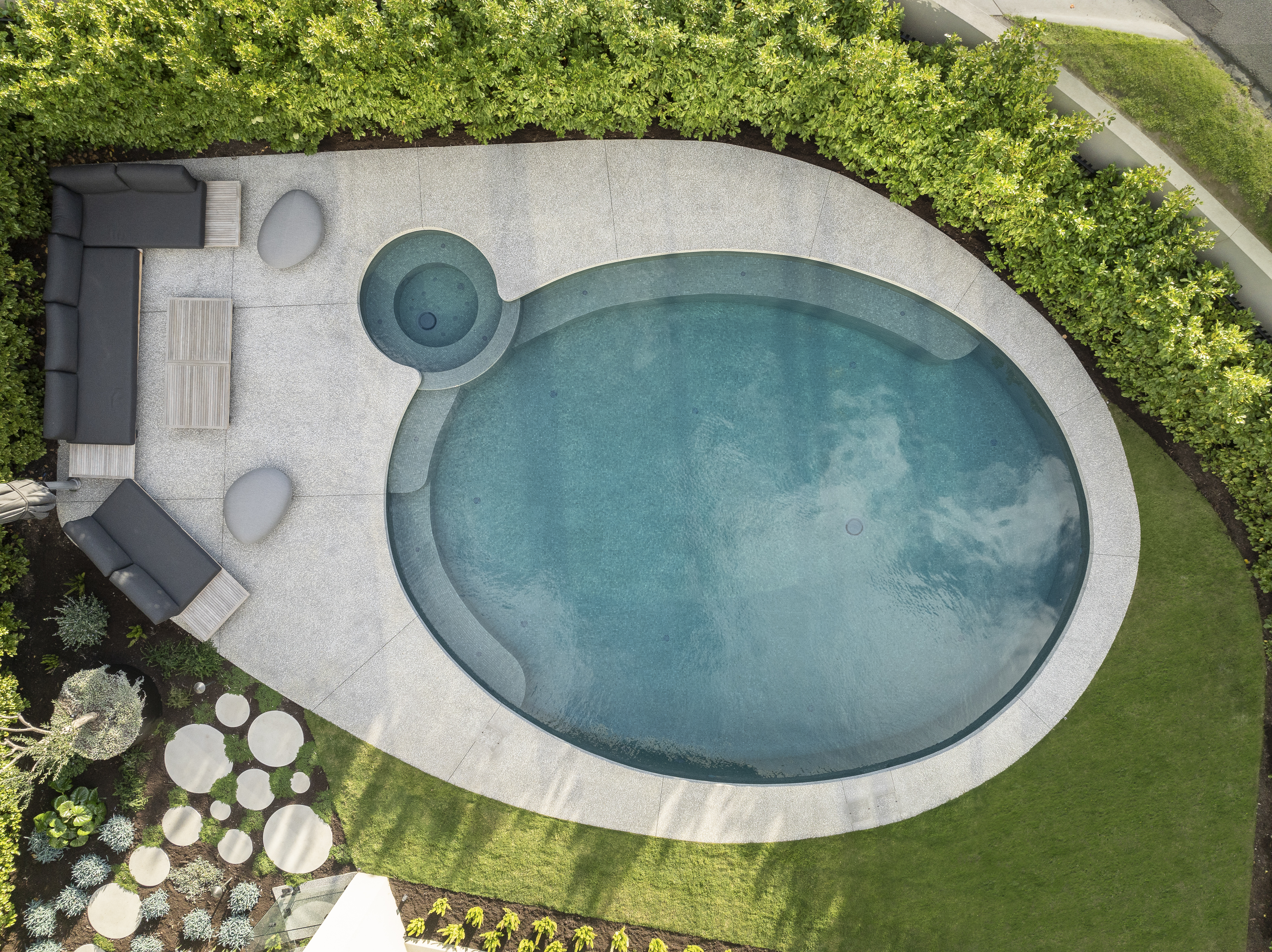 The hardscape features 54 linear meters of rendered walls capped with sleek 10mm steel, forming seating, privacy, and reflection zones.