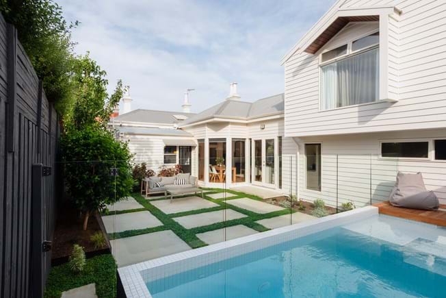 Featuring burnished concrete pads, a pristine pool, and lush planting, the Newtown Project combines style and practicality for year-round enjoyment.