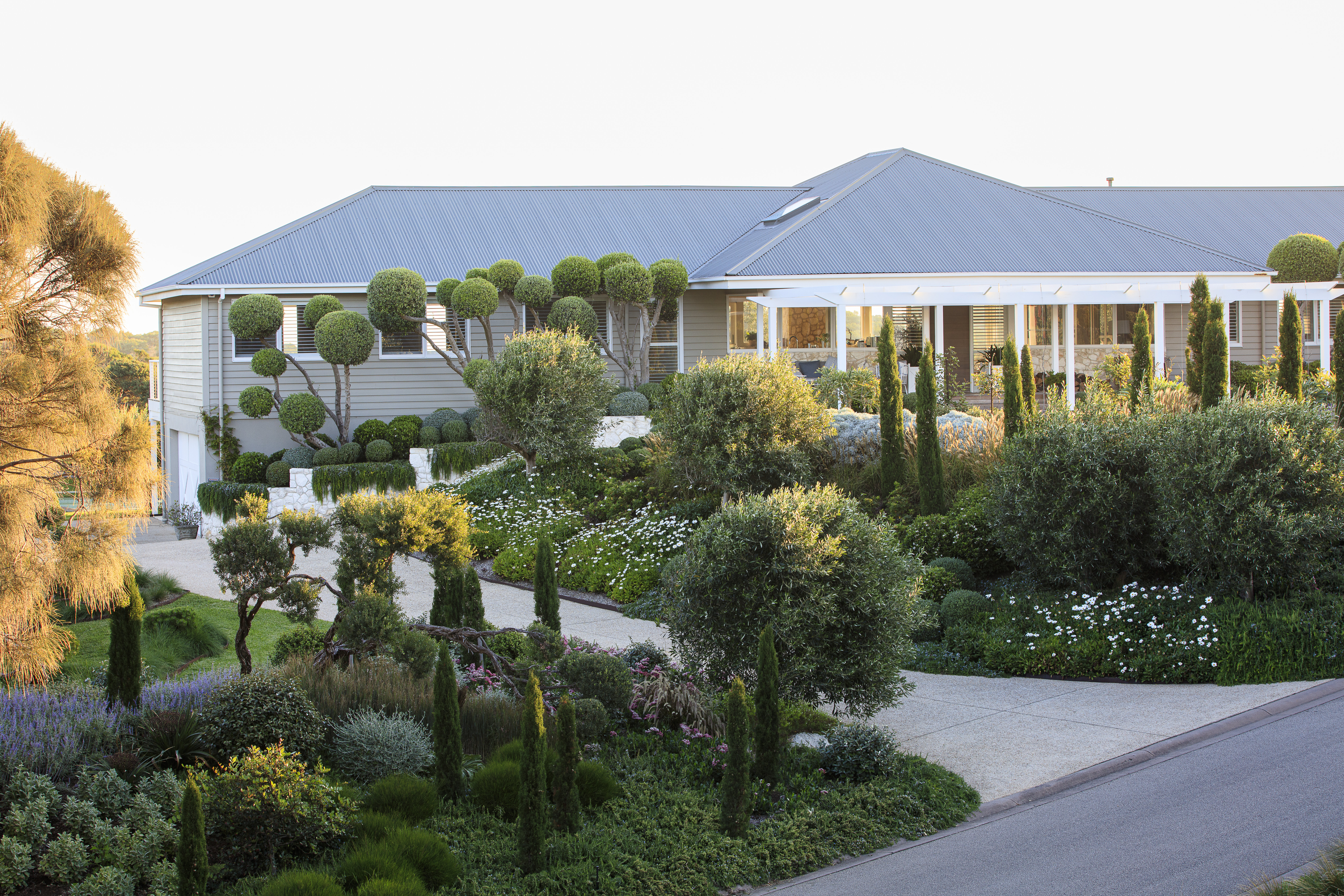 Structural elements like Cupressus and ornamental grasses combine with cloud-pruned Tea trees to create an elegant, resilient garden.